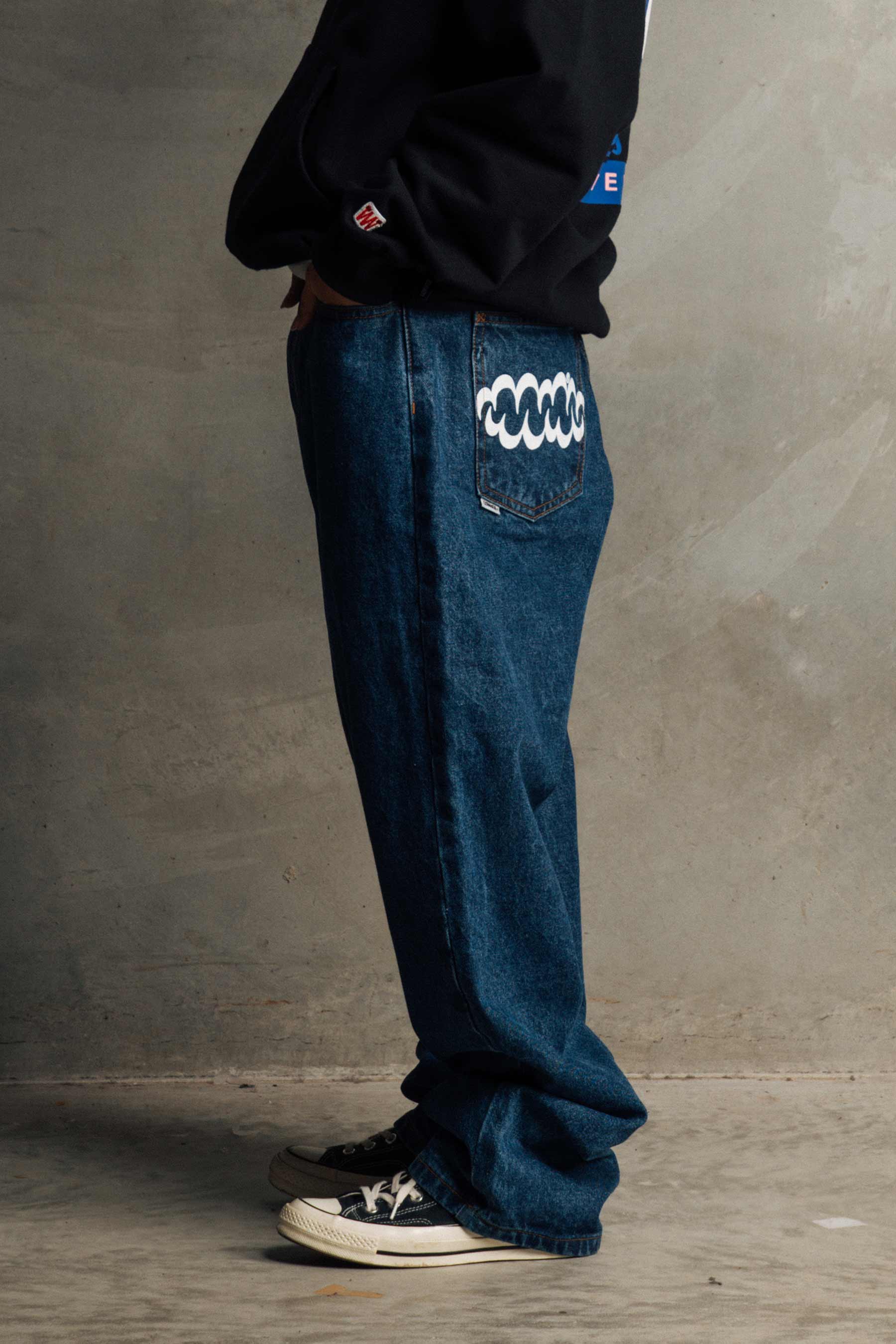 Our Remmy Jean is a slight reiteration of the Biggie Jean. The Remmy Jean is what we see as a true baggy, with a slight taper from the ankle to leg opening so it can sit on top of most shoe silhouettes.